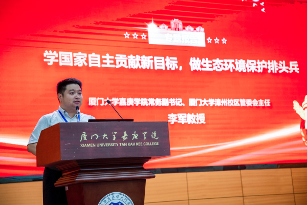 近日,一场以“学国家自主贡献新目标,做生态环境保护排头兵”为主题的专题党课在公共教学楼一号楼101多功能厅顺利举行。本次专题党课由厦门大学嘉庚学院党委常务副书记、厦门大学漳州校区管委会主任李军教授主讲,环境科学与工程学院300余名师生踊跃参与,共同探讨国家自主贡献新目标下的生态环境保护路径。党课由环境科学与工程学院党总支书记周亮主持。