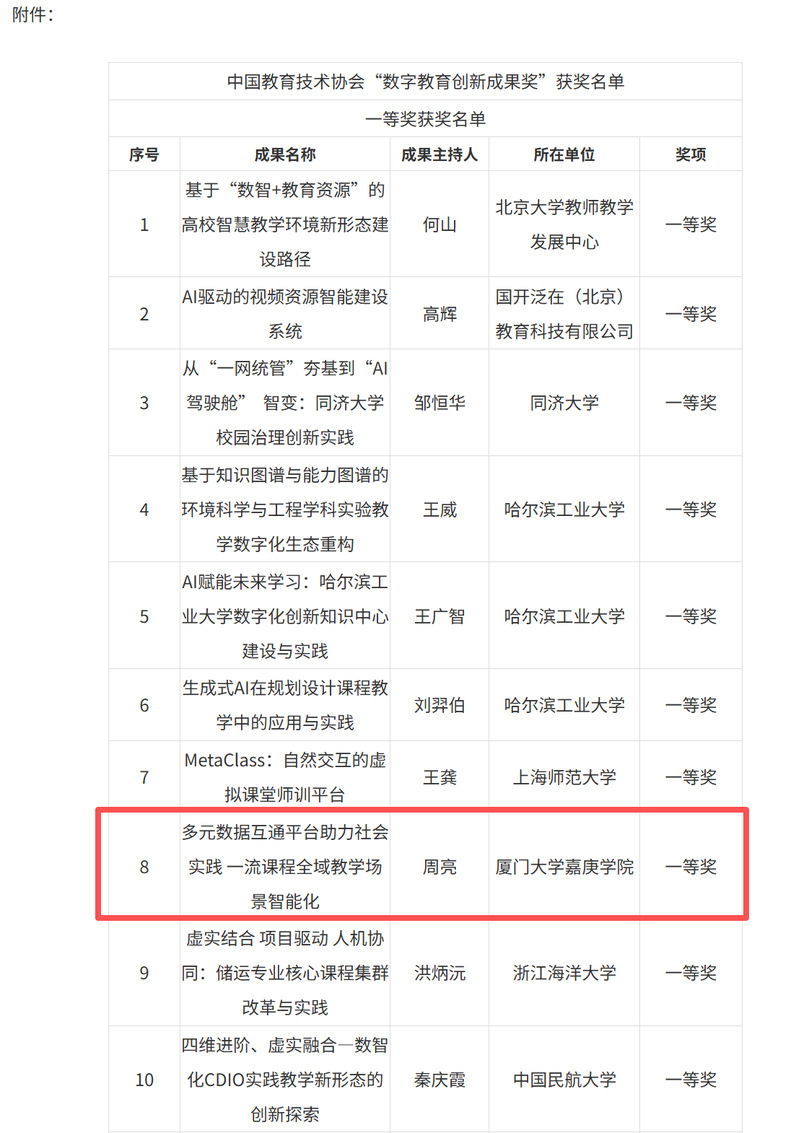 2025年11月4日,在第八届中国教育技术创新发展与应用成果大会上,我院成果《多元数据互通平台助力社会实践一流课程全域教学场景智能化》喜获首届“数字教育创新成果奖”全国一等奖。我校也是福建省唯一获得全国一等奖的高校。