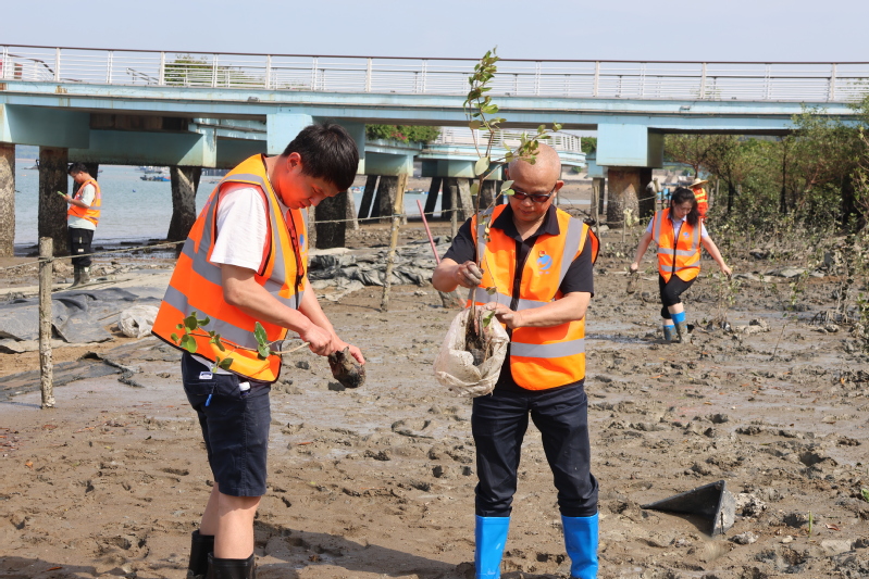 活动当天,企业员工、厦门大学嘉庚学院师生40余人组成志愿队伍,在潮汐适宜时段完成种植任务。志愿者们五人一组,分工协作挖坑、扶苗、填土,将一年生白骨壤袋装苗稳植于海沧大道未来海岸对面的滩涂区域。陈慧杰教授现场指导种植规范,确保树苗成活率。